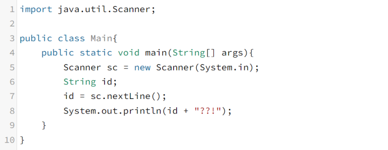 - 어떤 문자열을 입력해도 입력한 문자열 뒤에 ??!이 출력될 수 있도록 입력받은 문자열에 "??!"문자열을 더해서 출력한다.