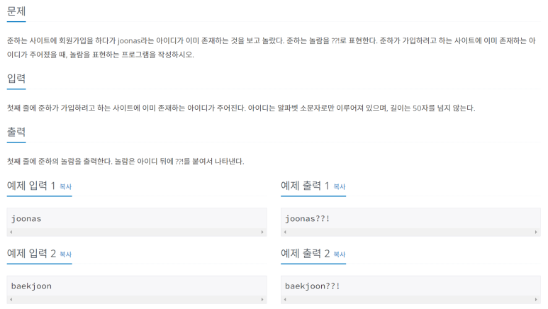 준하는 사이트에 회원가입을 하다가 joonas라는 아이디가 이미 존재하는 것을 보고 놀랐다. 준하는 놀람을 ??!로 표현한다. 준하가 가입하려고 하는 사이트에 이미 존재하는 아이디가 주어졌을 때