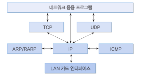 맨 위의 응용 프로그램은 TCP와 UDP를 사용해 데이터 송수신 기능을 수행하지만, 네트워크 계층의 IP프로토콜을 직접 사용하기도 한다. ICMP와 ARP/RARP는 네트워크 계층에 소속되어 IP동작을 도와준다.
