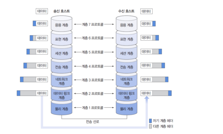 전송 데이터는 송신 호스트의 응용계층에서 시작해 하위 계층으로 순차적으로 전달되어, 최종적으로 물리 계층에서 수신 호스트에 전달된다. 수신 호스트의 물리 계층에 도착한 데이터는 다시 역순으로 물리 계층에서 시작해 상위 계층으로 순차적으로 전달되어, 최종적으로 응용 계층에 도착하게 된다.