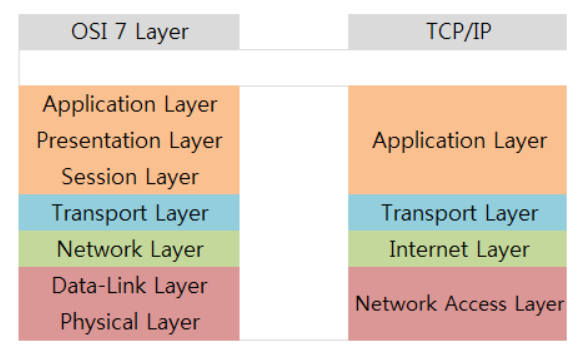 source: https://goitgo.tistory.com/25 위 그림은 OSI 7계층 참조모델과 TCP/IP모델을 비교한 것이다. OSI 참조모델은 7계층, TCP/IP모델은 4계층으로 나뉜 것을 알 수 있다.